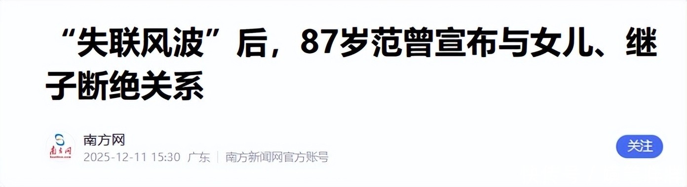 12日,老艺术家范曾公开发文表示,要和亲生女儿范晓慧、继子范仲达断绝亲子关系,跟他们断绝一切合作。